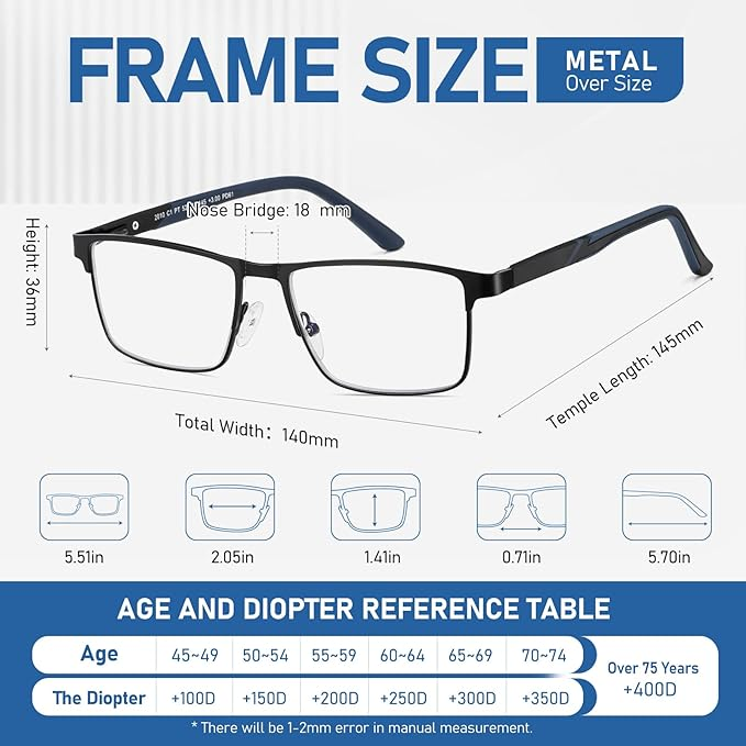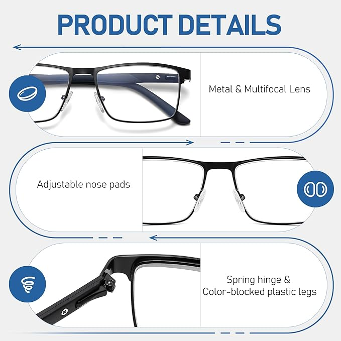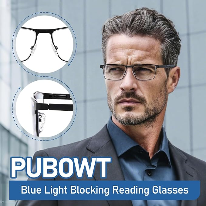 • Metal and Spring Hinge: Pubowt multifocal reading glasses for men and women. Lightweight metal frames with spring hinges, color-blocked temples, and adjustable nose pad provide all-day comfort. Stylish and perfect for extended wear.